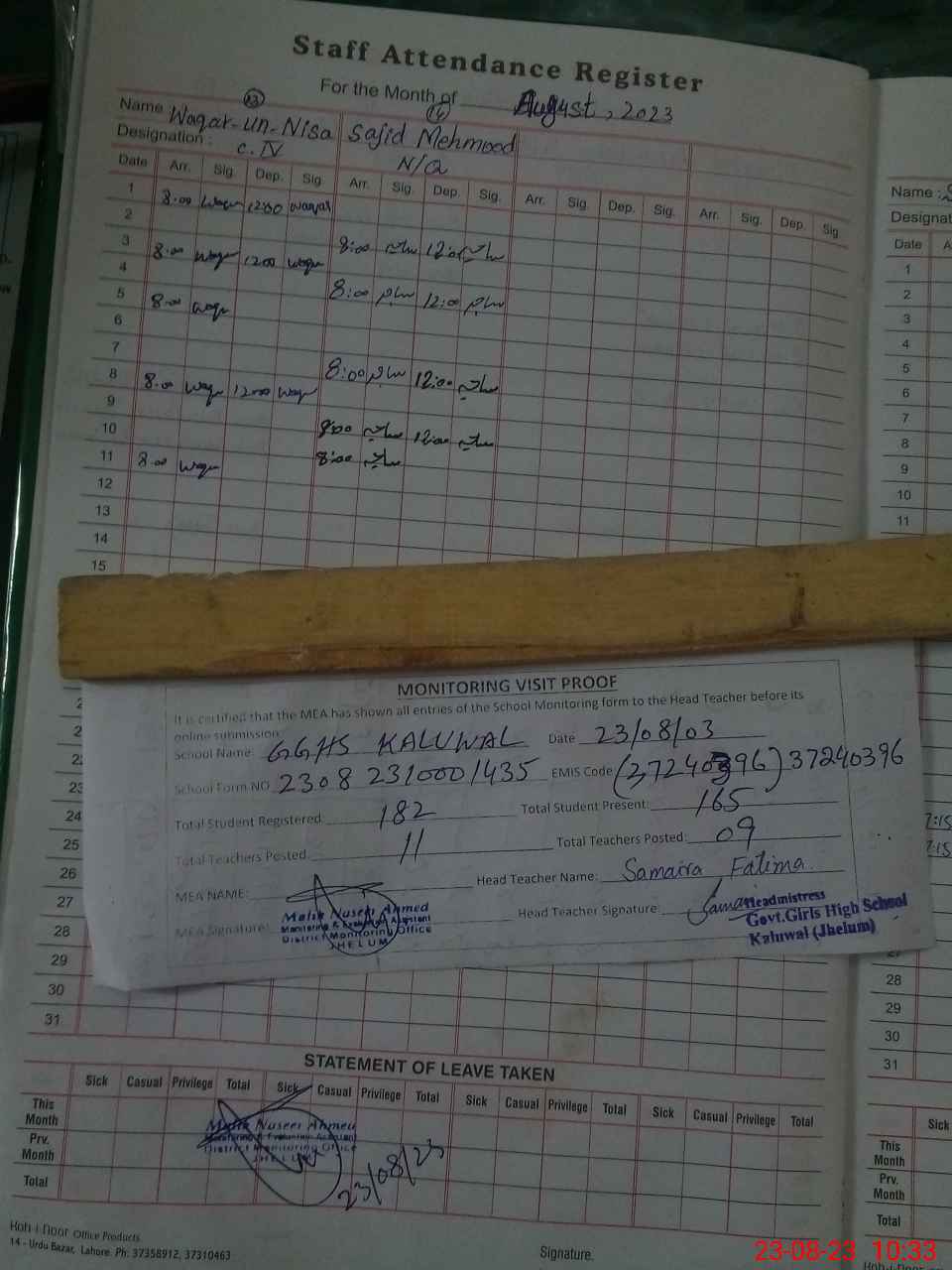 | Attendance Register | Head Teacher | MEA with School | Visit Proof |