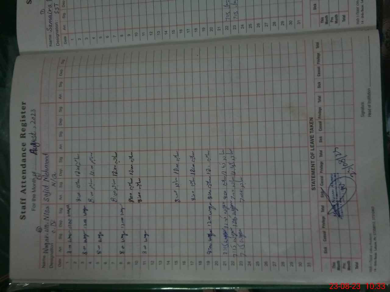 | CNIC | Full Name | Designation | R/C | Absence During Last Calender Month |
