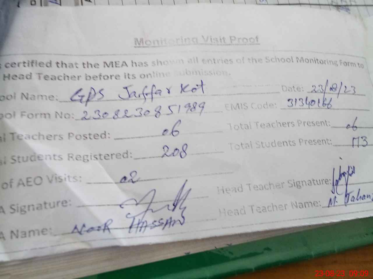 | Attendance Register | Head Teacher | MEA with School | Visit Proof |
