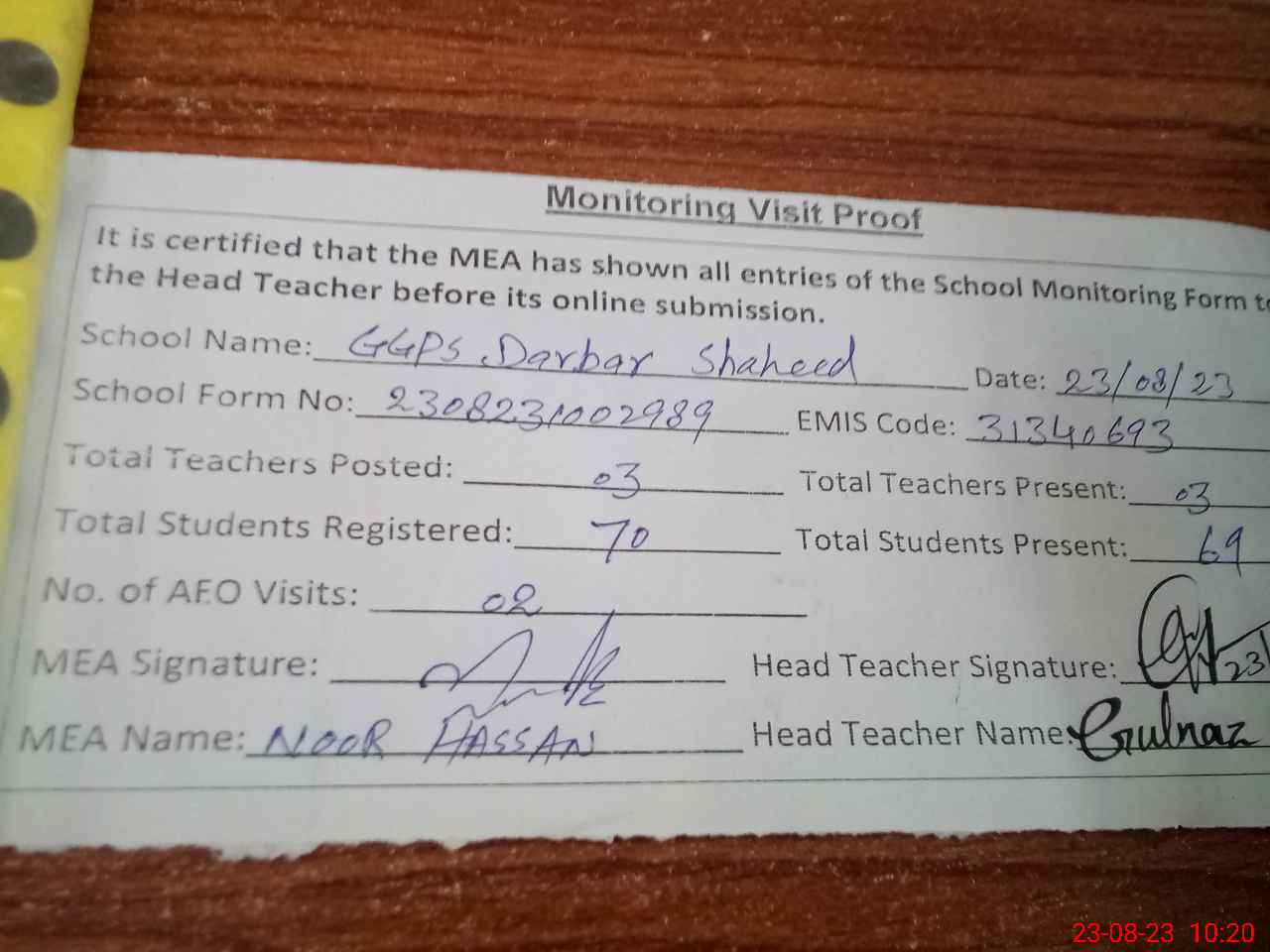 | Attendance Register | Head Teacher | MEA with School | Visit Proof |