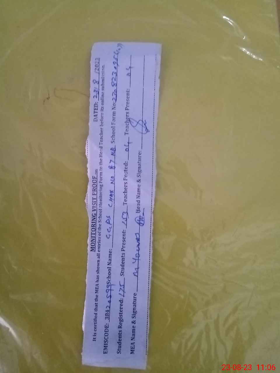 | Attendance Register | Head Teacher | MEA with School | Visit Proof |