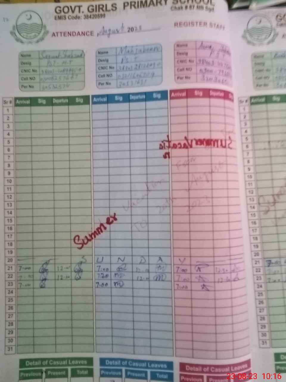 | CNIC | Full Name | Designation | R/C | Absence During Last Calender Month |
