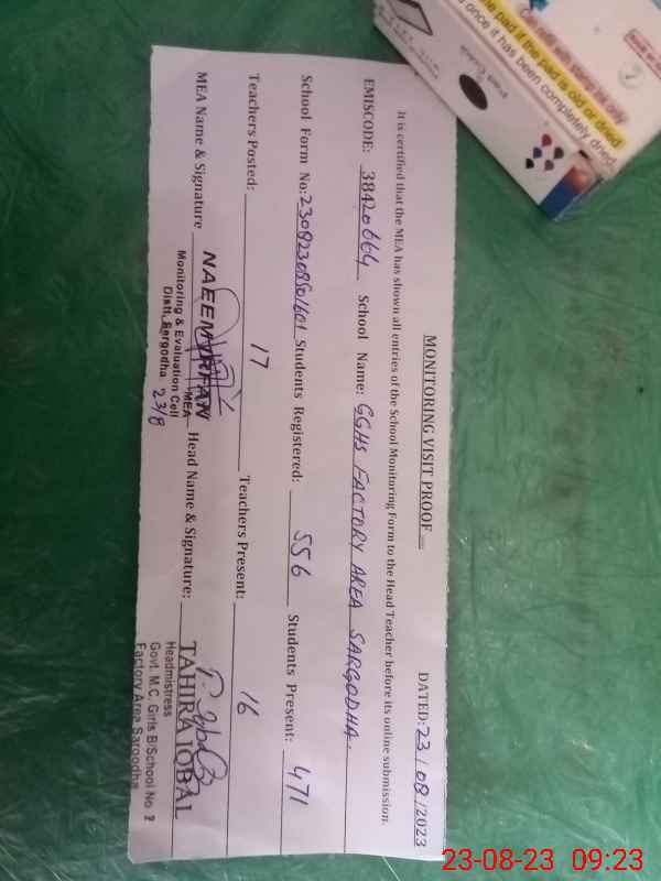 | EMIS Code: 38420664 | Name of School: GGHS FACTORY AREA SARGODHA | |||