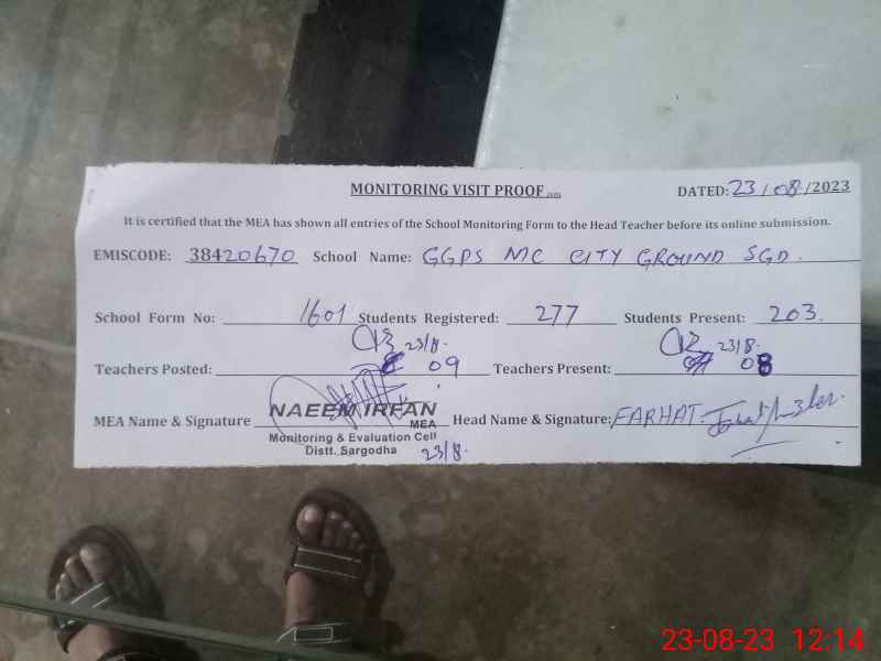 | EMIS Code: 38420670 | Name of School: GGPS MC CITY GROUND SARGODHA | |||