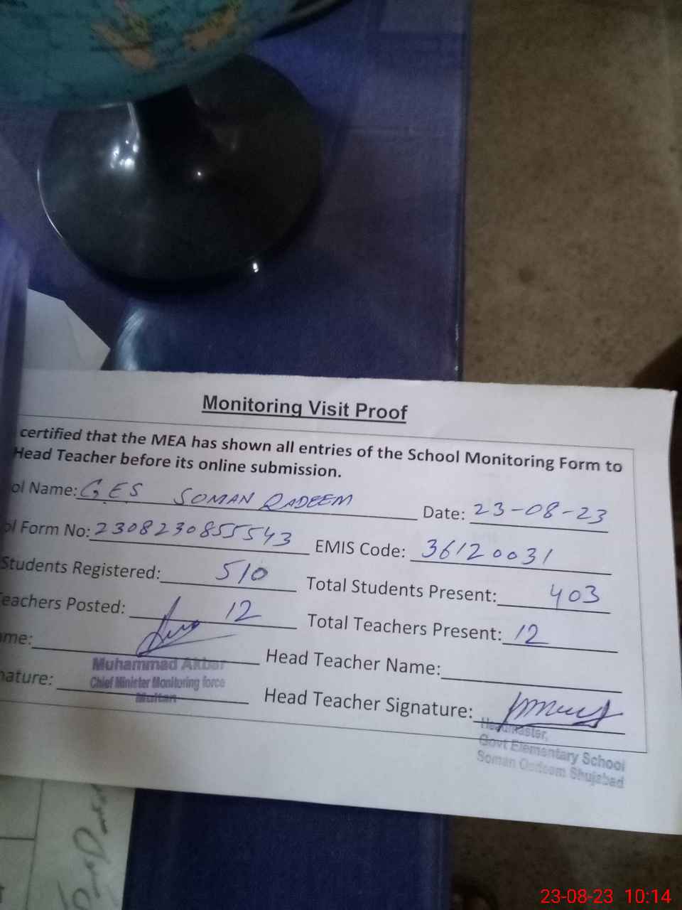 | Attendance Register | Head Teacher | MEA with School | Visit Proof |