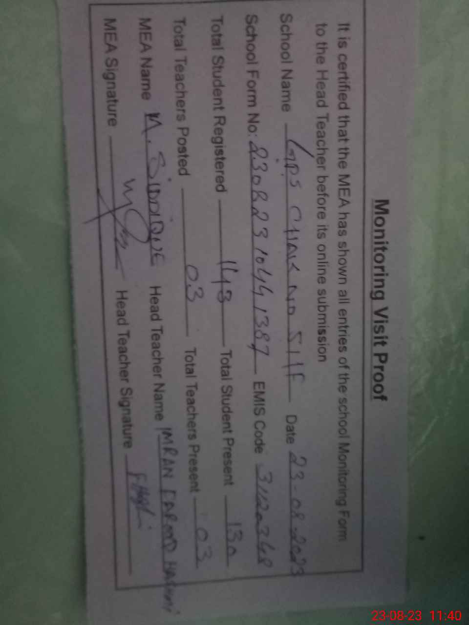 | Attendance Register | Head Teacher | MEA with School | Visit Proof |