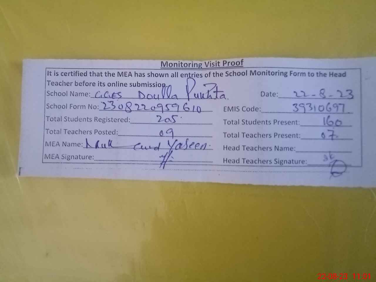 | Attendance Register | Head Teacher | MEA with School | Visit Proof |