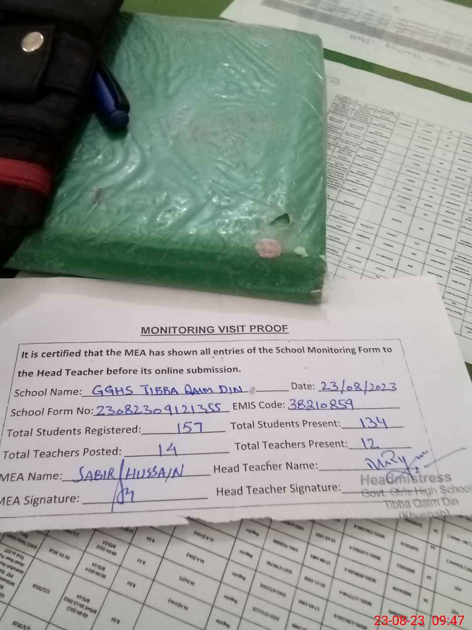 | Attendance Register | Head Teacher | MEA with School | Visit Proof |