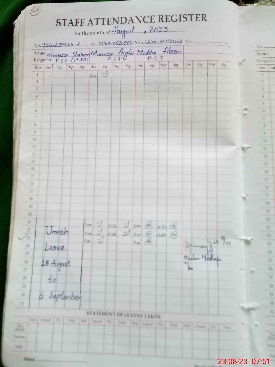 | CNIC | Full Name | Designation | R/C | Absence During Last Calender Month |