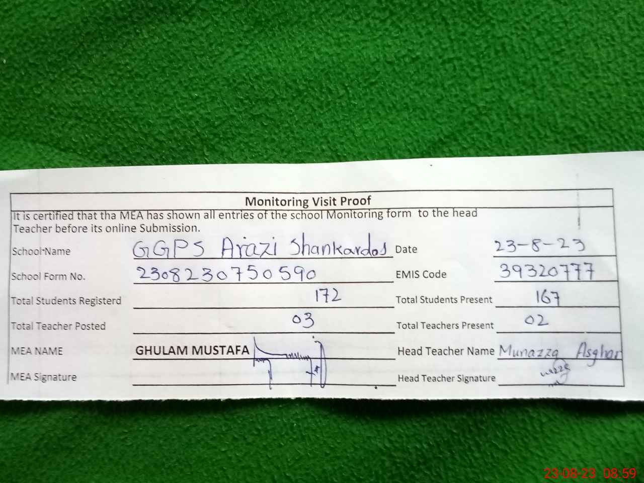 | Monitoring Date: 23-08-2023 | Start Time: 23-08-2023 07:50 AM | End Time: 23-08-2023 08:59 AM | Name of MEA: GH**** MU**** | |