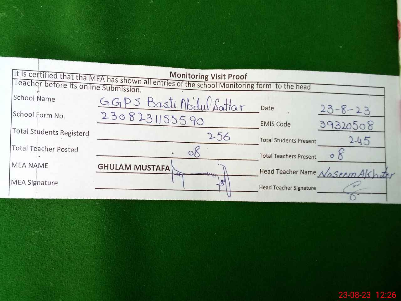 | Attendance Register | Head Teacher | MEA with School | Visit Proof |