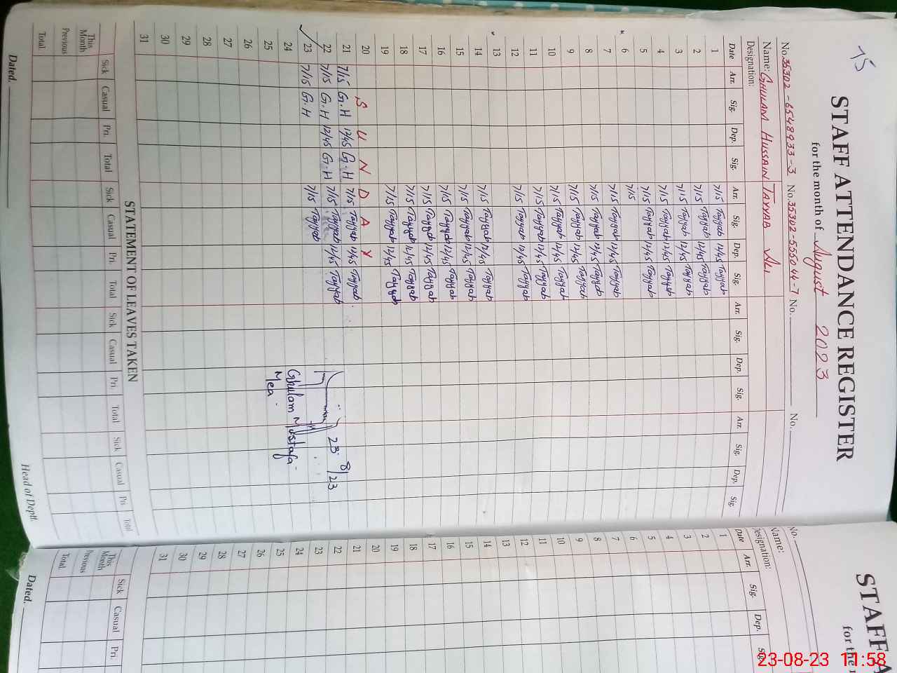| CNIC | Full Name | Designation | R/C | Absence During Last Calender Month |