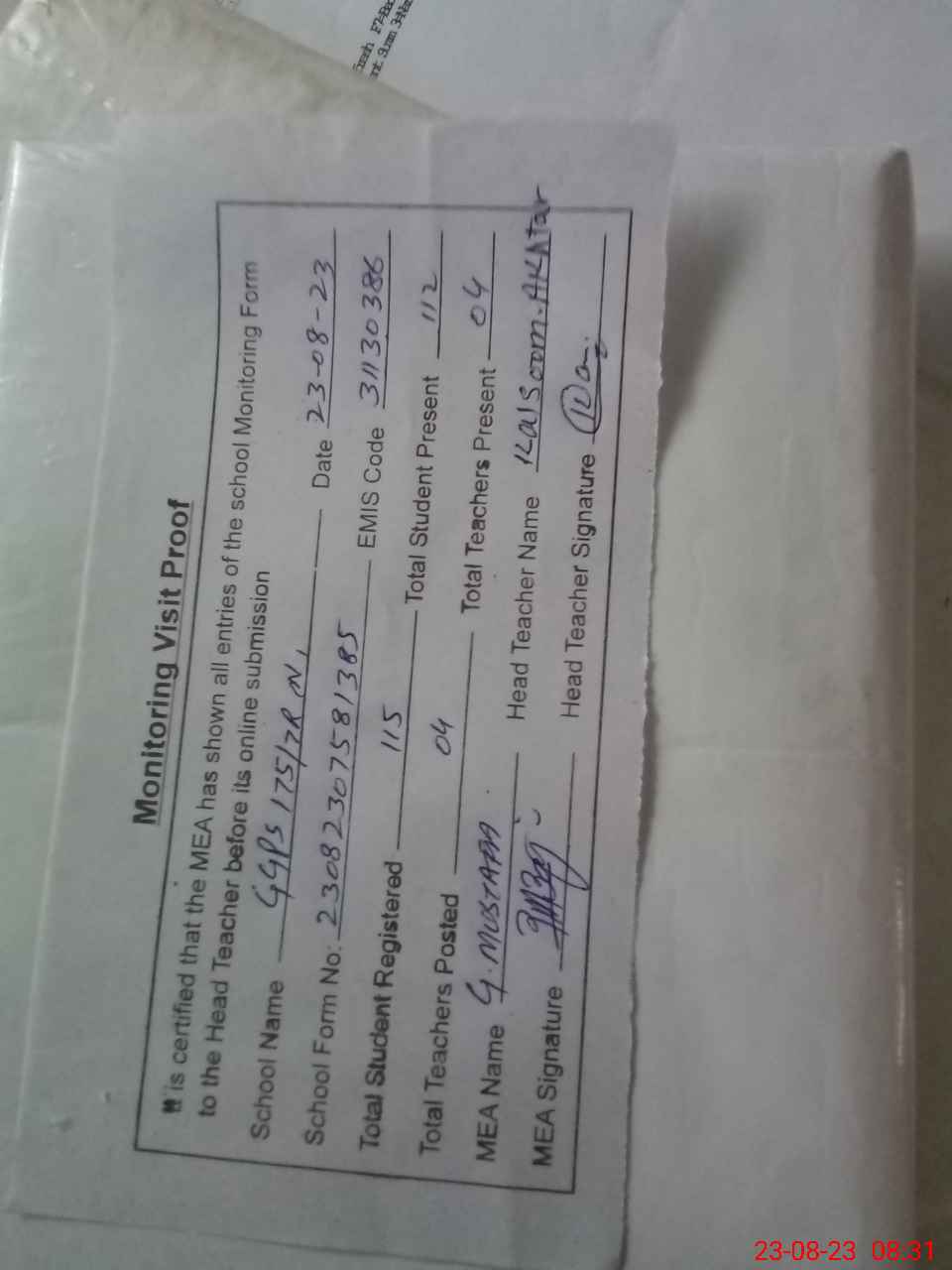 | Attendance Register | Head Teacher | MEA with School | Visit Proof |