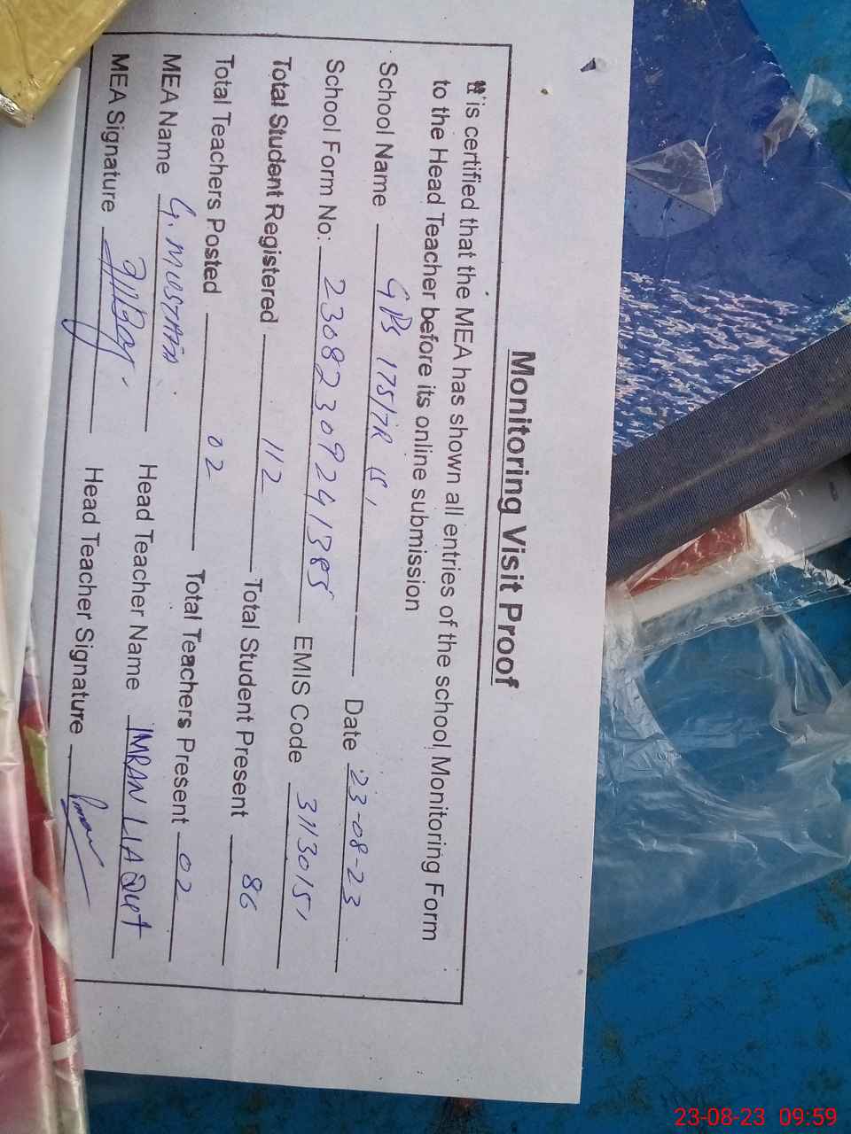 | Attendance Register | Head Teacher | MEA with School | Visit Proof |