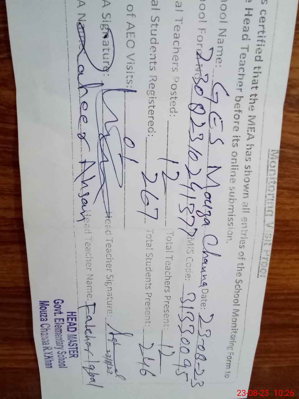 | Monitoring Date: 23-08-2023 | Start Time: 23-08-2023 09:09 AM | End Time: 23-08-2023 10:30 AM | Name of MEA: Za**** Ah**** | |