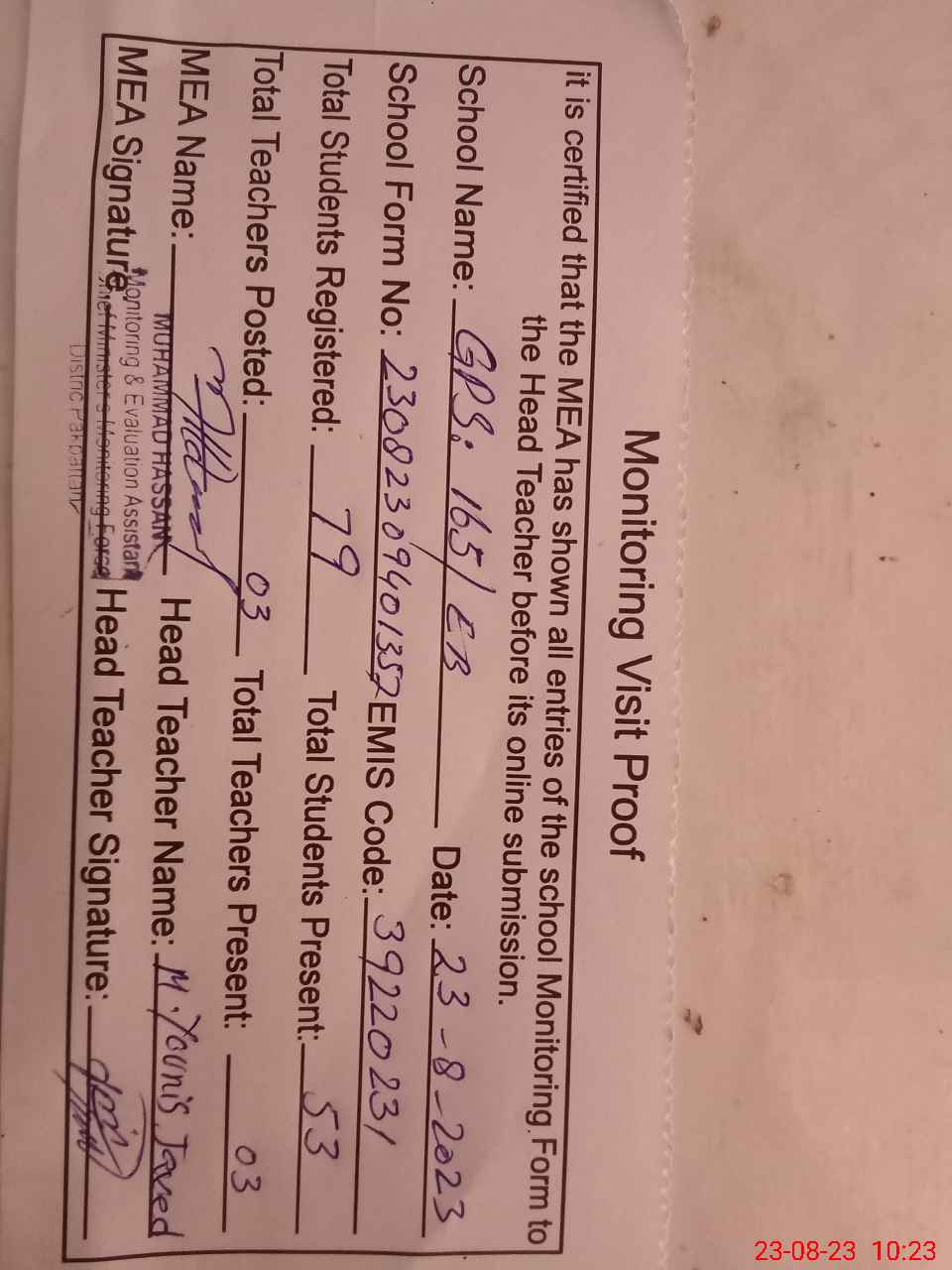 | Attendance Register | Head Teacher | MEA with School | Visit Proof |
