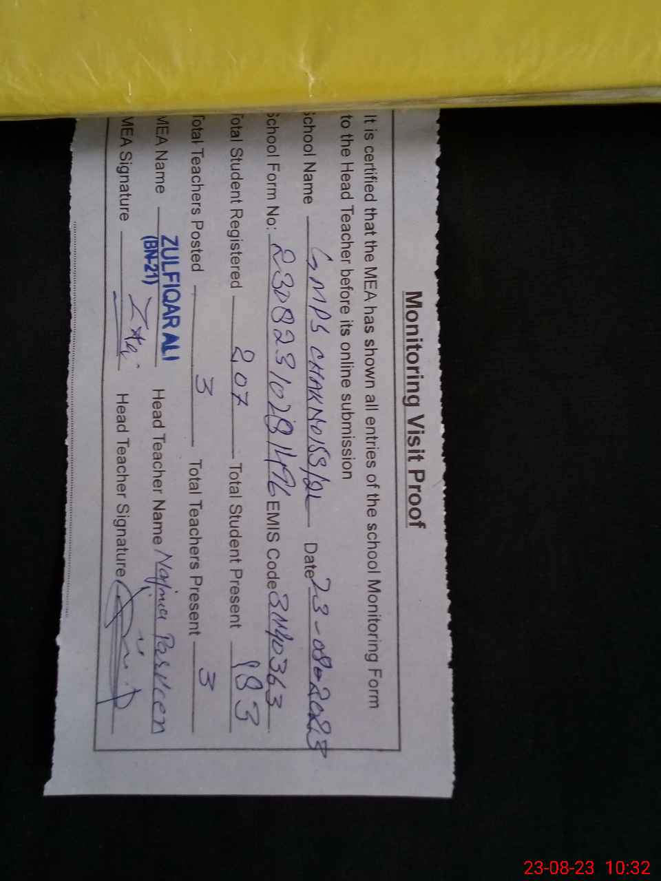 | Monitoring Date: 23-08-2023 | Start Time: 23-08-2023 10:15 AM | End Time: 23-08-2023 10:33 AM | Name of MEA: Zu**** Al**** BN**** | |