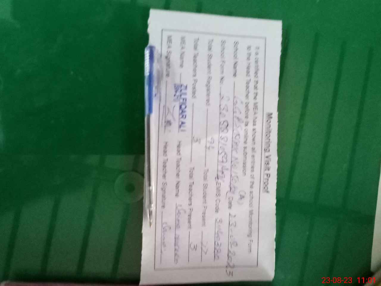 | Monitoring Date: 23-08-2023 | Start Time: 23-08-2023 10:50 AM | End Time: 23-08-2023 11:03 AM | Name of MEA: Zu**** Al**** BN**** | |