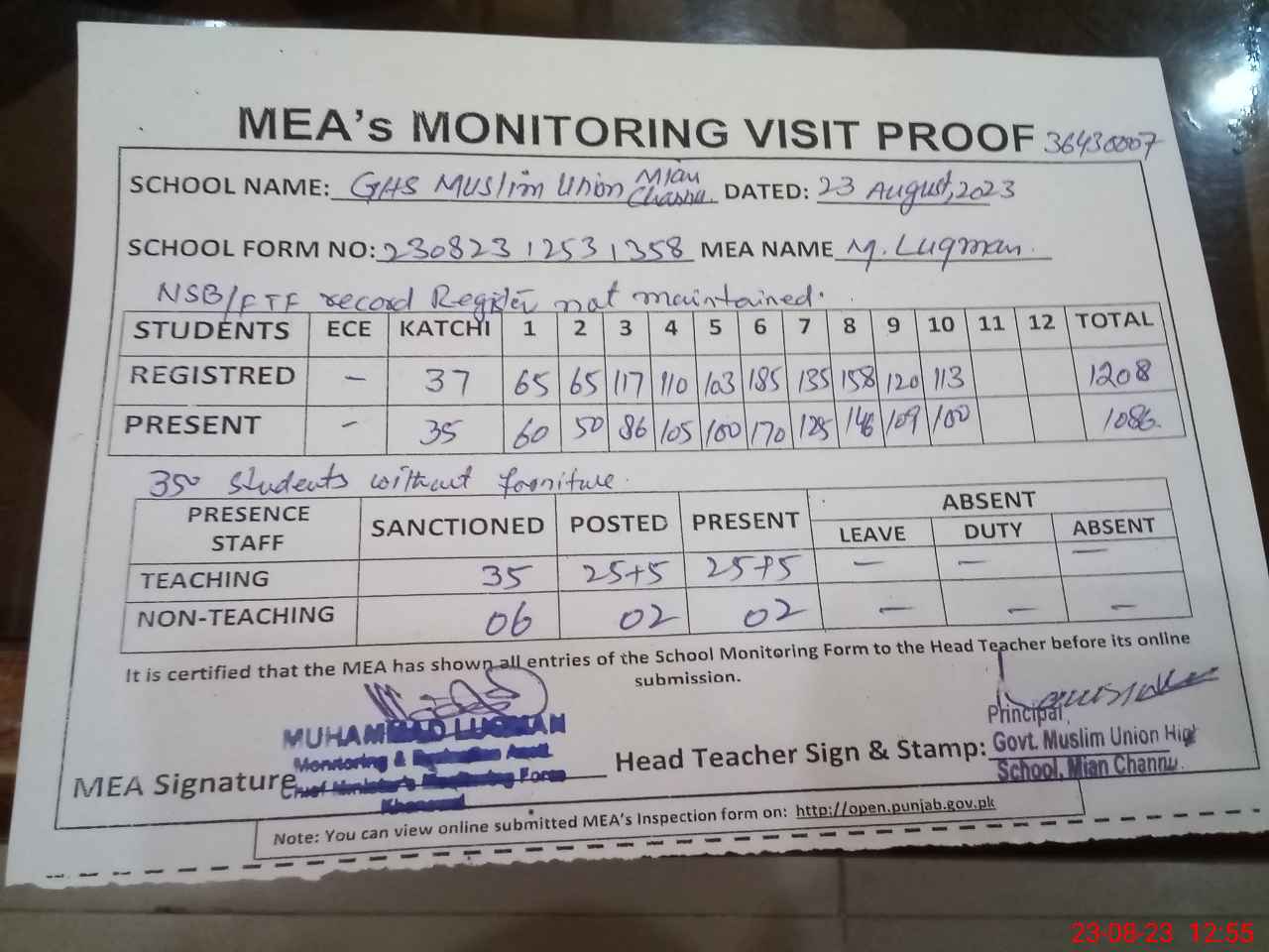 | EMIS Code: 36430007 | Name of School: GHS MUSLIM UNION MIAN CHANNU, MIAN CHANNU | |||