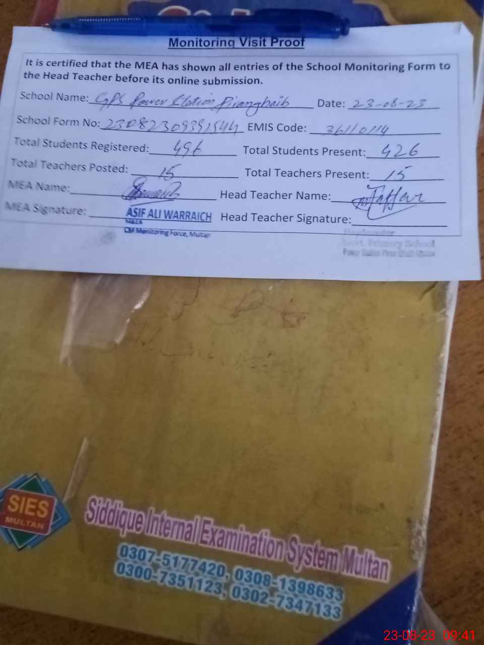 | Attendance Register | Head Teacher | MEA with School | Visit Proof |