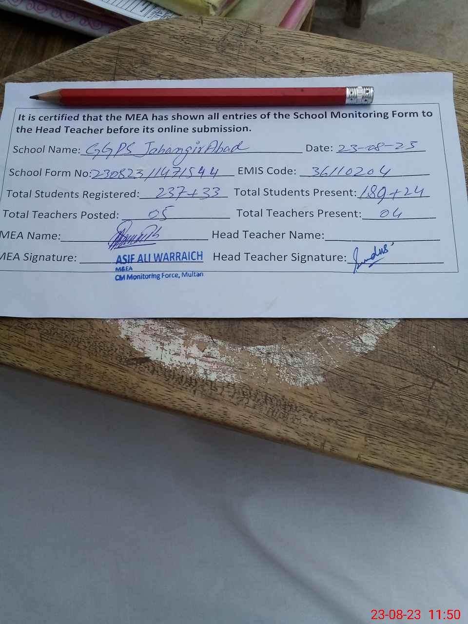 | EMIS Code: 36110204 | Name of School: GGPS JAHANGIR ABAD MULTAN | |||