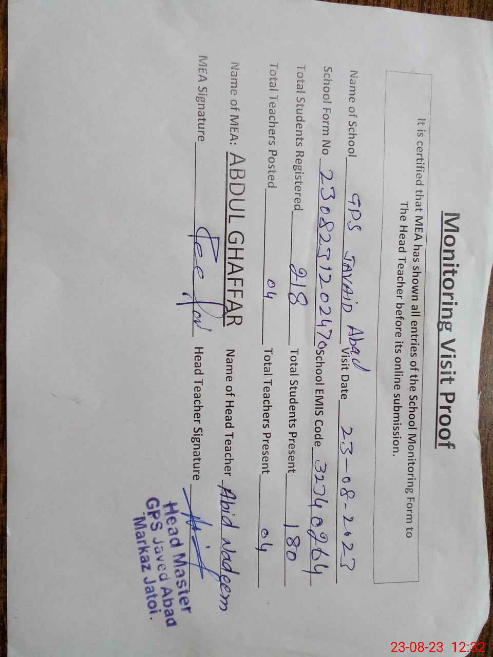 | EMIS Code: 32340264 | Name of School: GPS S JAVAID ABAD | |||