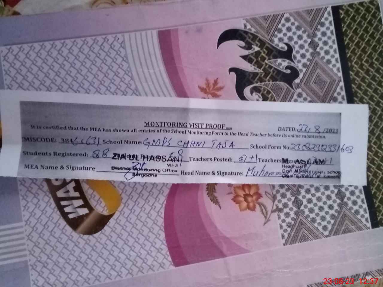 | Certified that this School was Inspected by the Undersigned MEA/DMO Today and the Information Stated Above is as Per Record. | |||||
