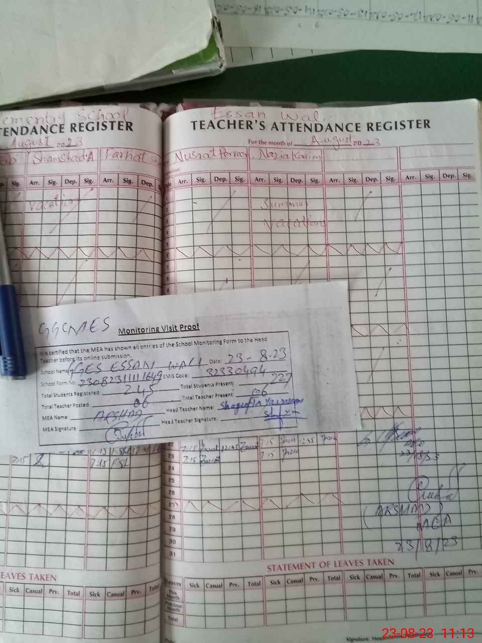 | Attendance Register | Head Teacher | MEA with School | Visit Proof |