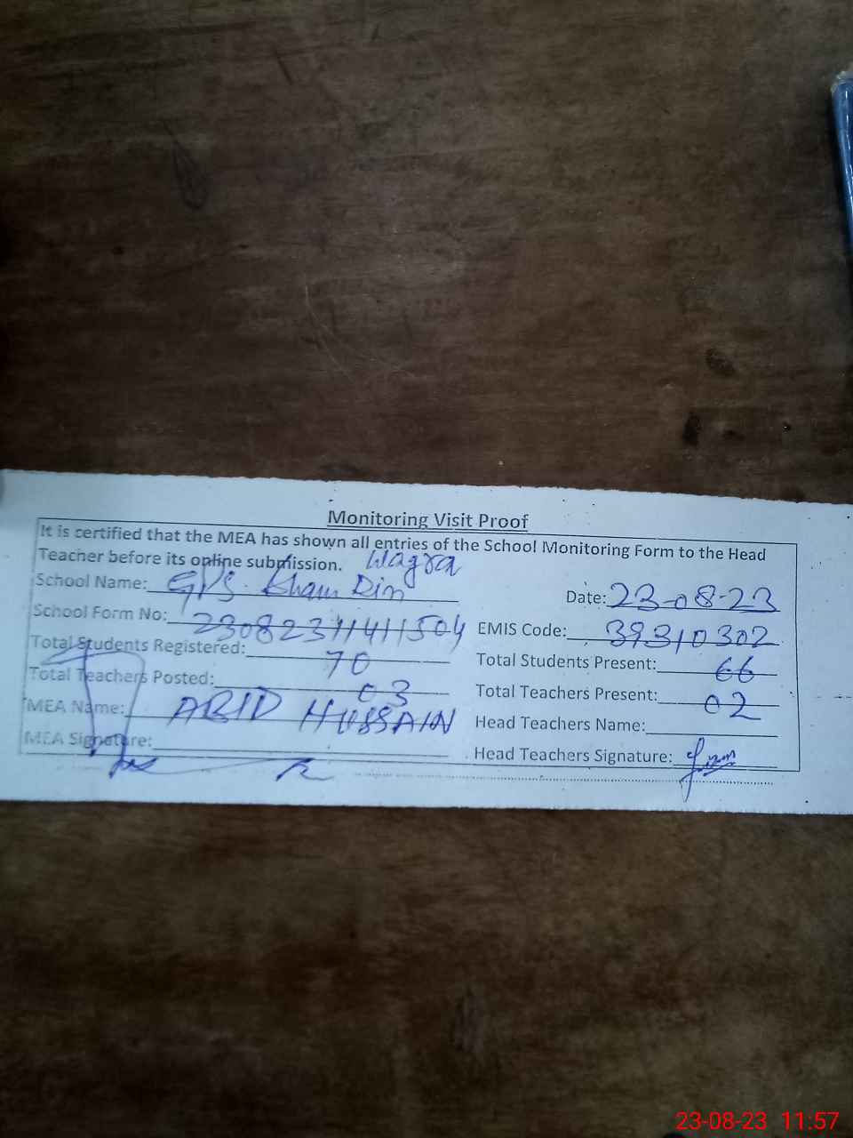 | Attendance Register | Head Teacher | MEA with School | Visit Proof |