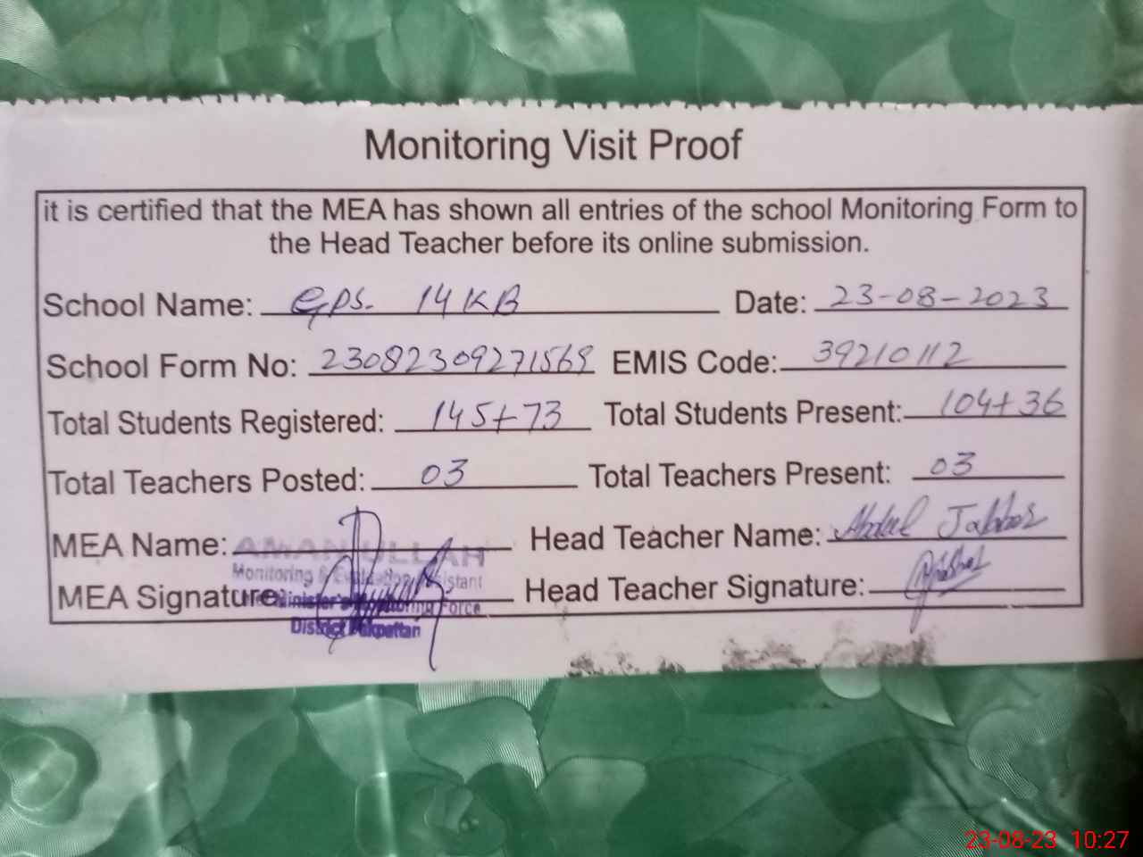 | Attendance Register | Head Teacher | MEA with School | Visit Proof |