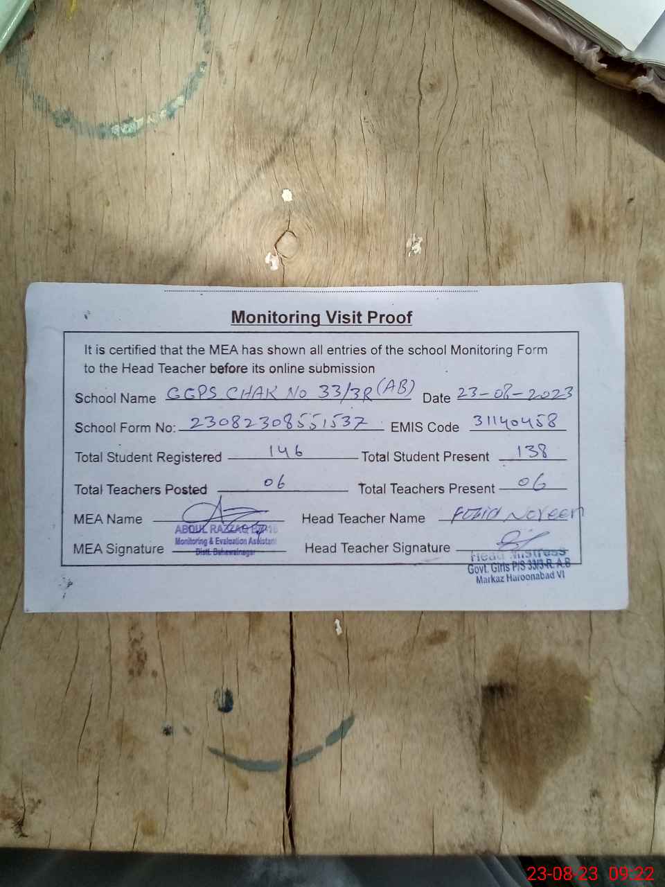 | EMIS Code: 31140458 | Name of School: GGPS CHAK NO 33/3-R AB | |||