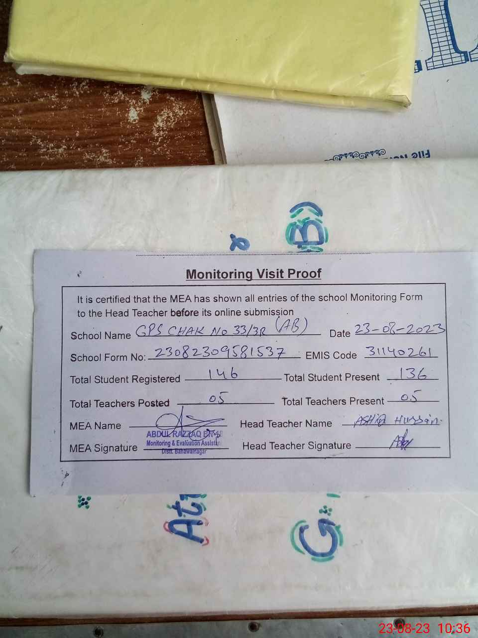 | Attendance Register | Head Teacher | MEA with School | Visit Proof |