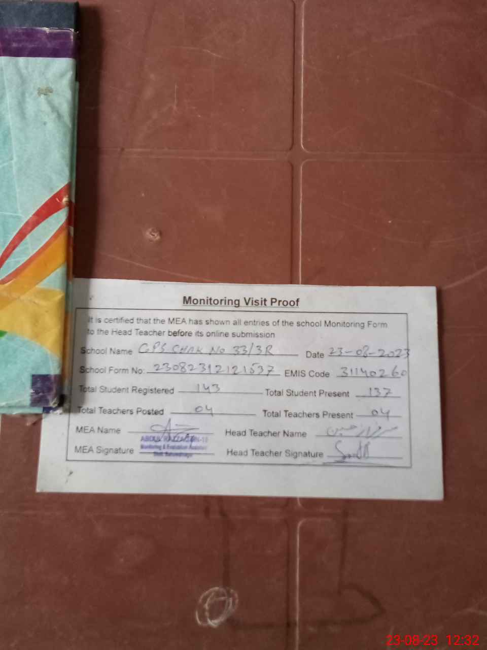 | Attendance Register | Head Teacher | MEA with School | Visit Proof |