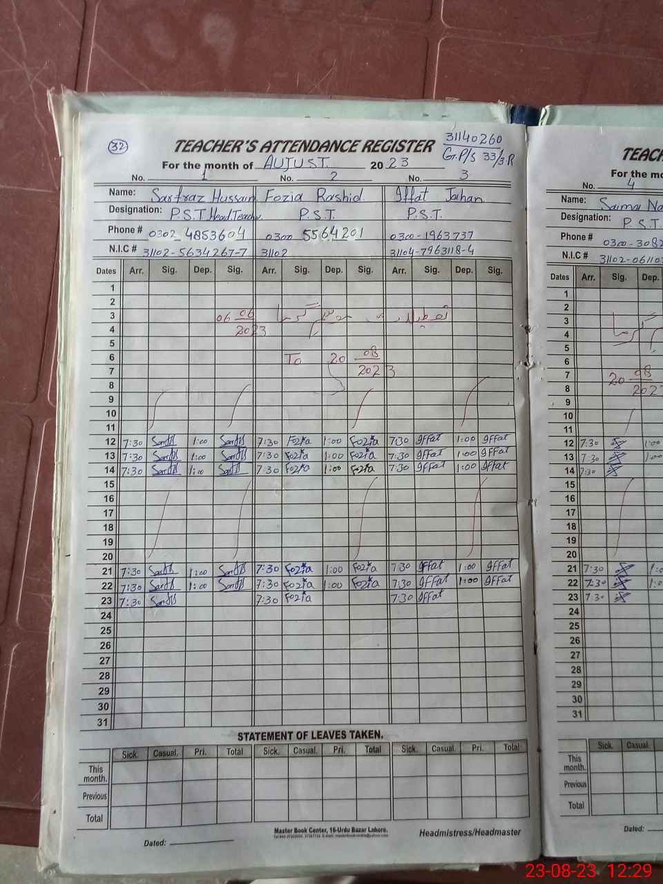 | CNIC | Full Name | Designation | R/C | Absence During Last Calender Month |