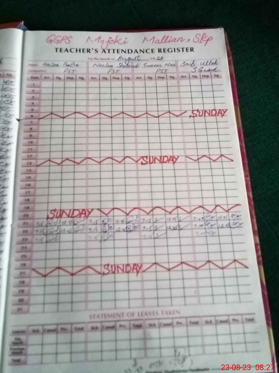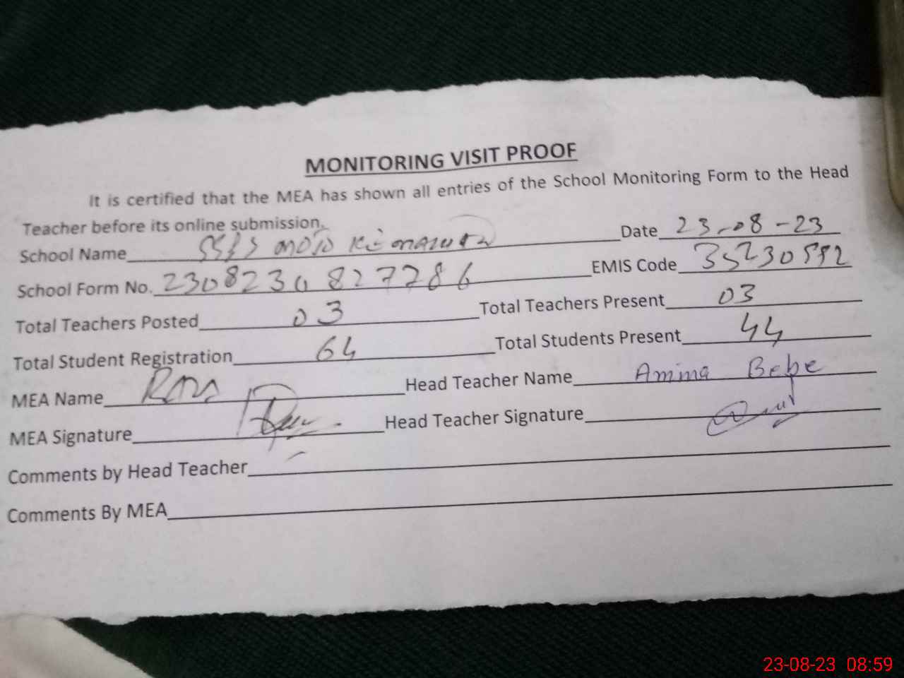 | Attendance Register | Head Teacher | MEA with School | Visit Proof |