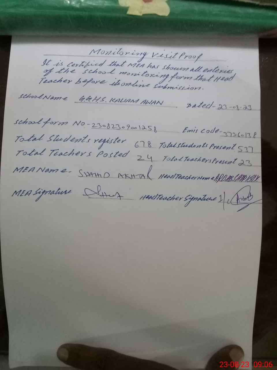 | Attendance Register | Head Teacher | MEA with School | Visit Proof |