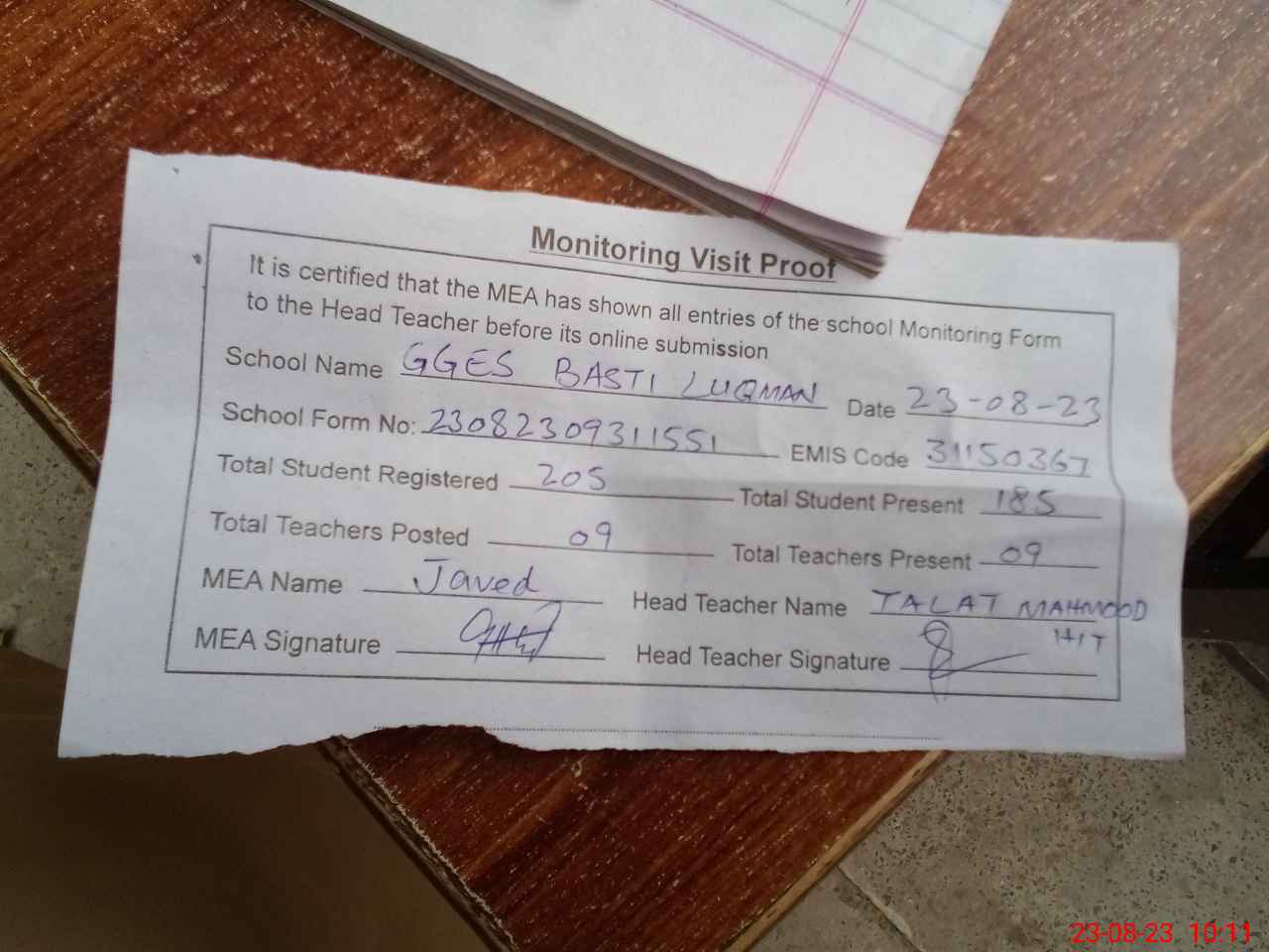 | Attendance Register | Head Teacher | MEA with School | Visit Proof |