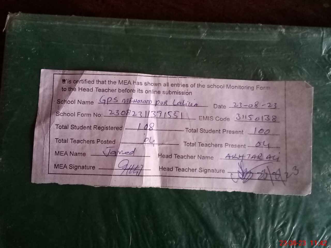 | EMIS Code: 31150138 | Name of School: GPS MEHMOOD PUR LALAY KA | |||