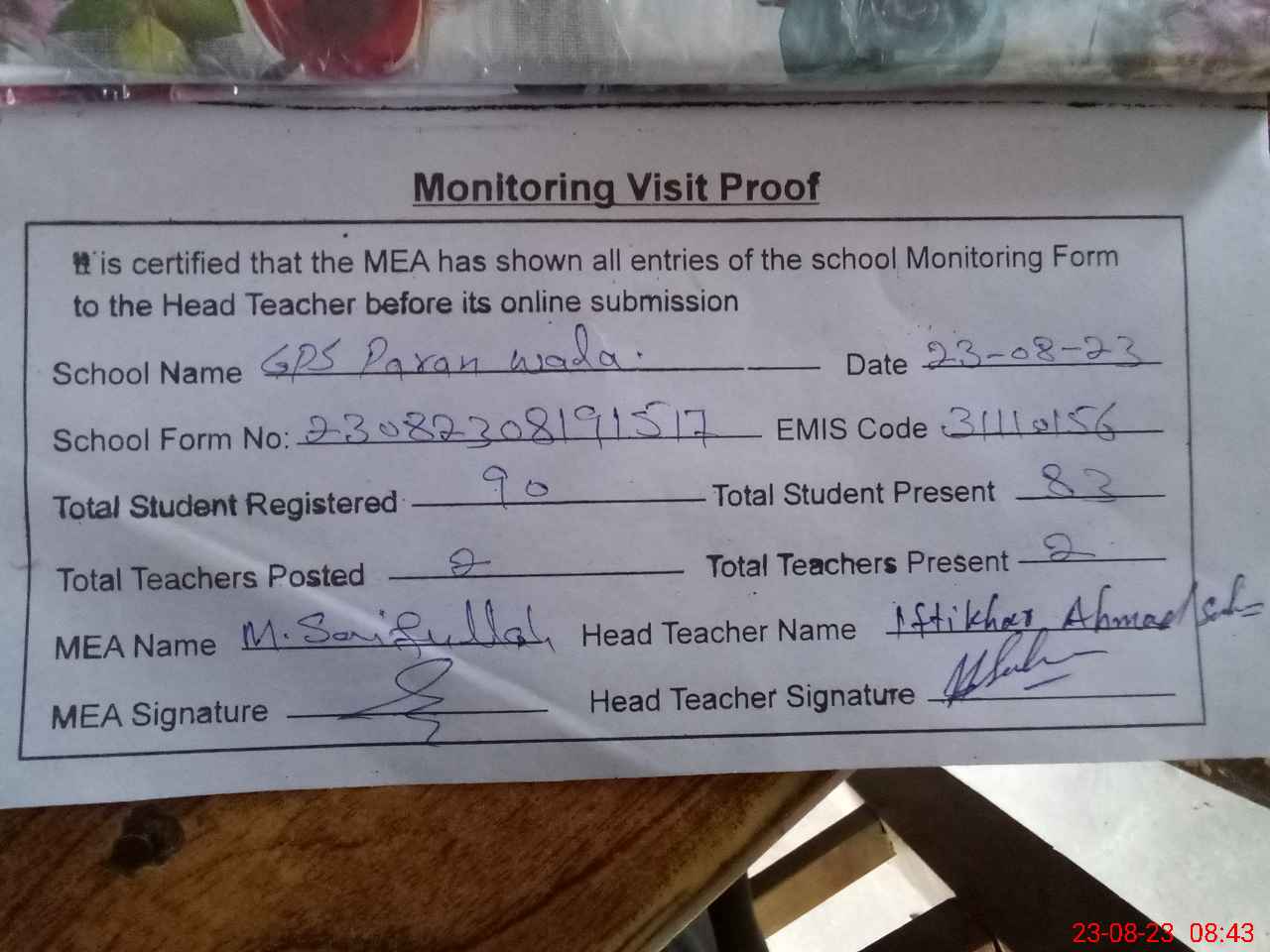 | Attendance Register | Head Teacher | MEA with School | Visit Proof |