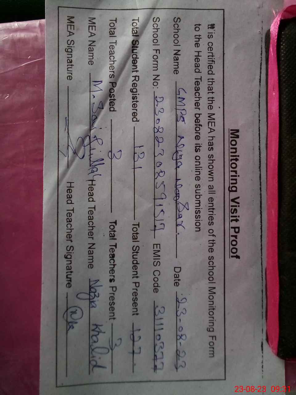 | Attendance Register | Head Teacher | MEA with School | Visit Proof |