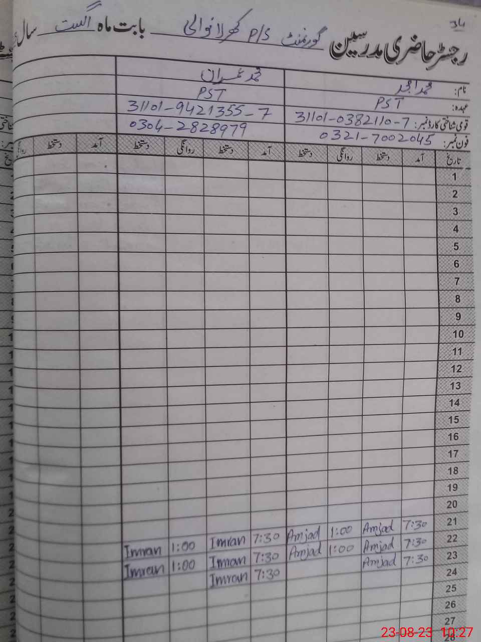 | CNIC | Full Name | Designation | R/C | Absence During Last Calender Month |