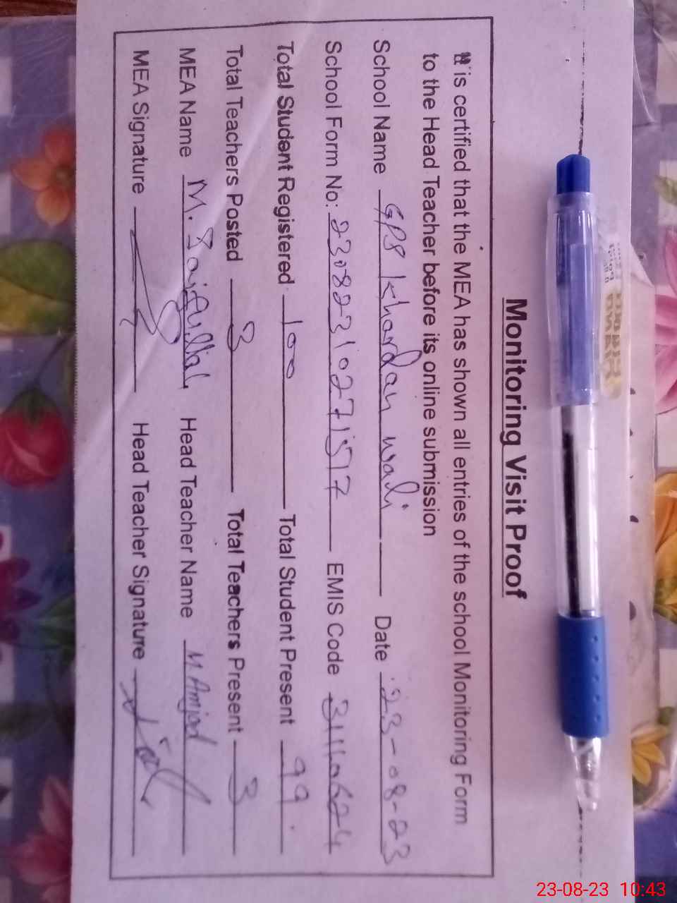 | Attendance Register | Head Teacher | MEA with School | Visit Proof |