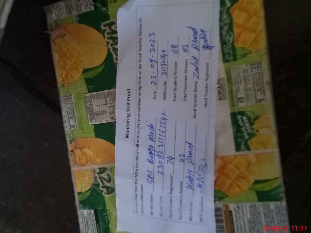 | Attendance Register | Head Teacher | MEA with School | Visit Proof |