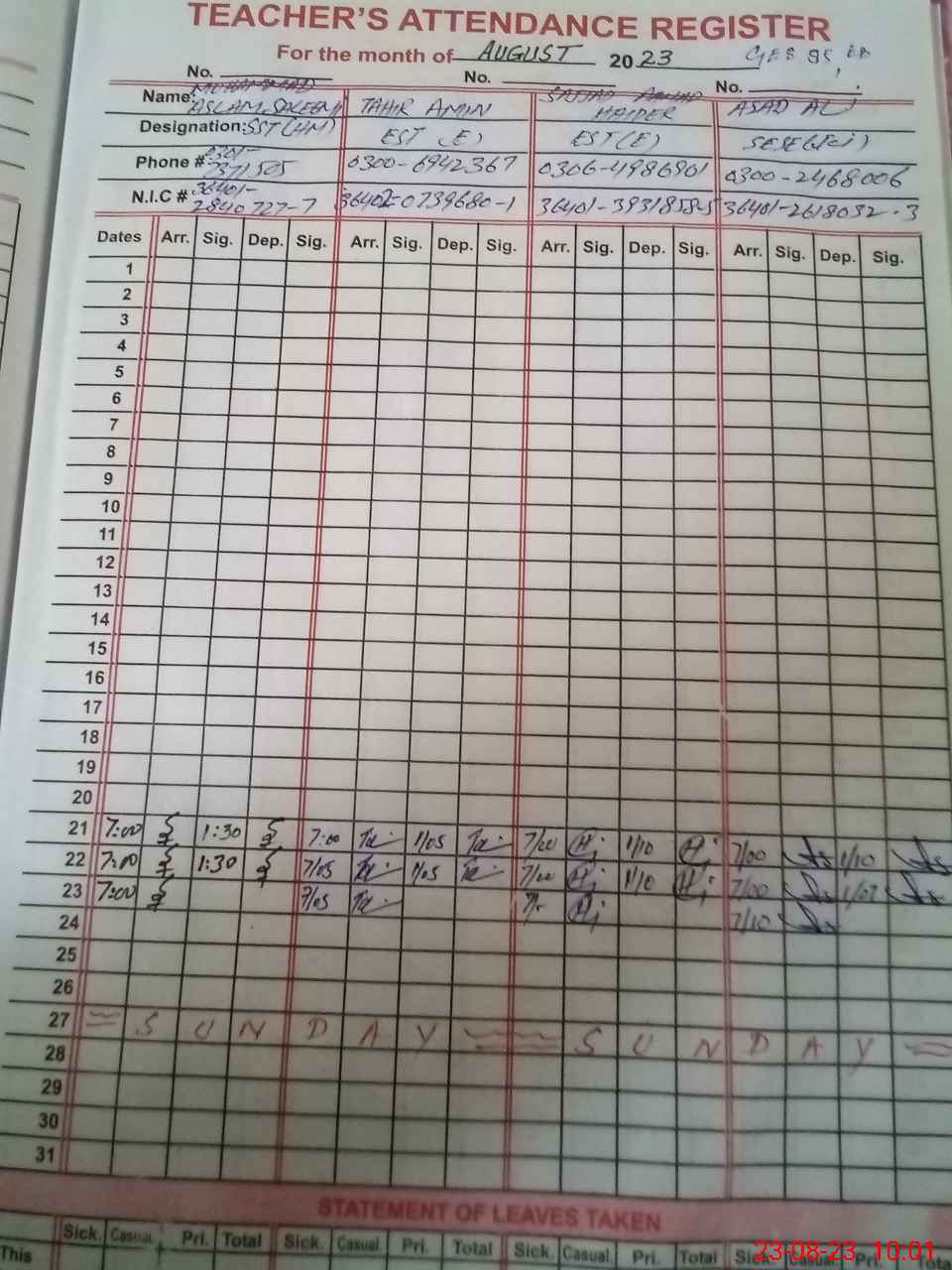 | Name: Ir**** Al**** Designation: (School Headmaster's/Headmistress's) SST (GENERAL) Phone/Cell Number: 03**** |