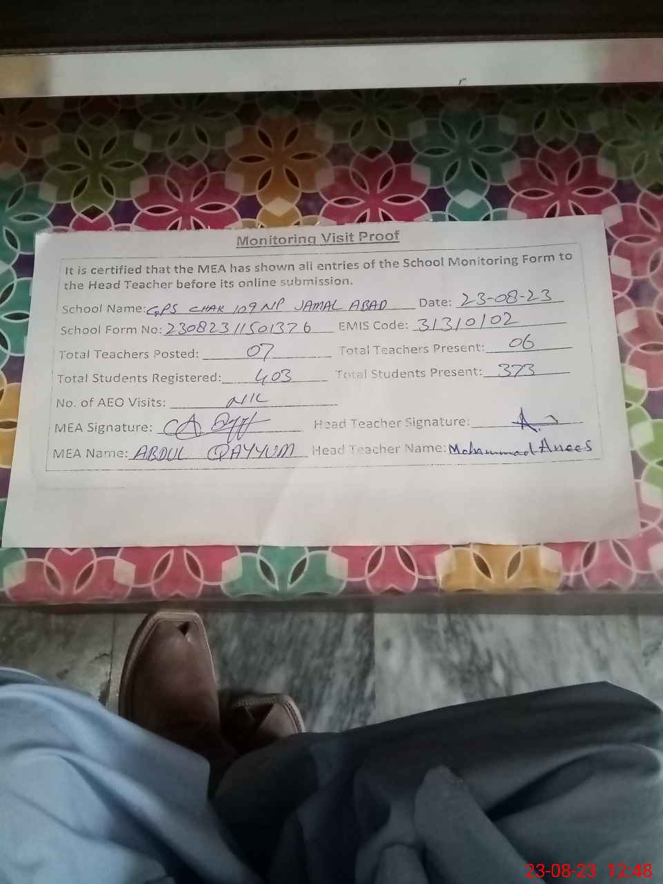| Attendance Register | Head Teacher | MEA with School | Visit Proof |