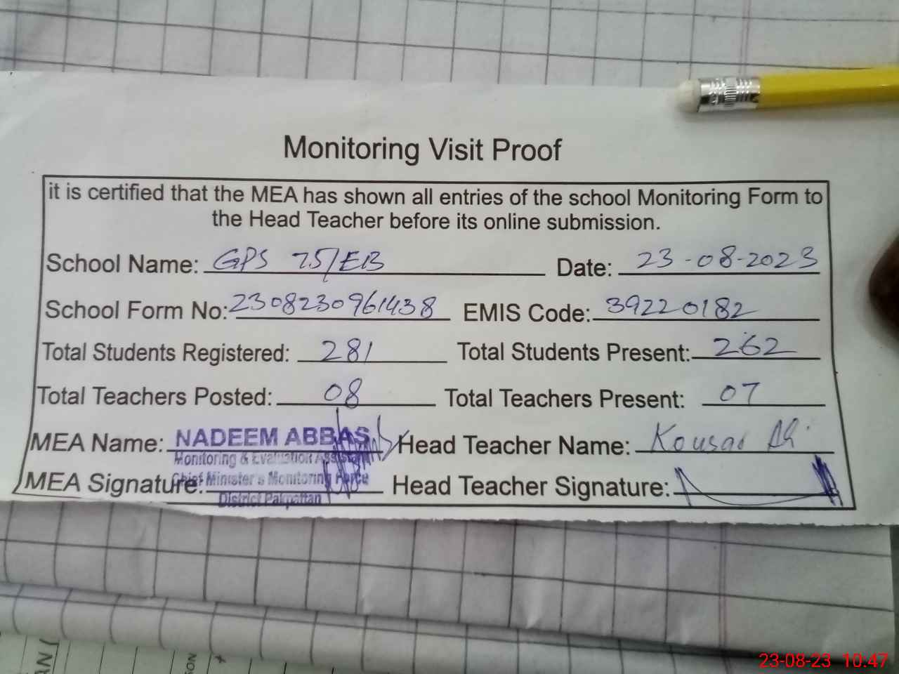| Attendance Register | Head Teacher | MEA with School | Visit Proof |