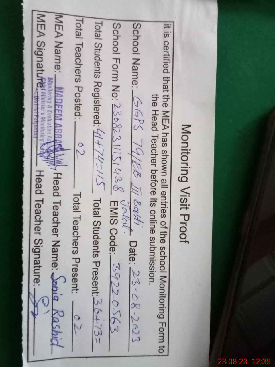 | EMIS Code: 39220563 | Name of School: GGPS 79/EB III basti jalal | |||