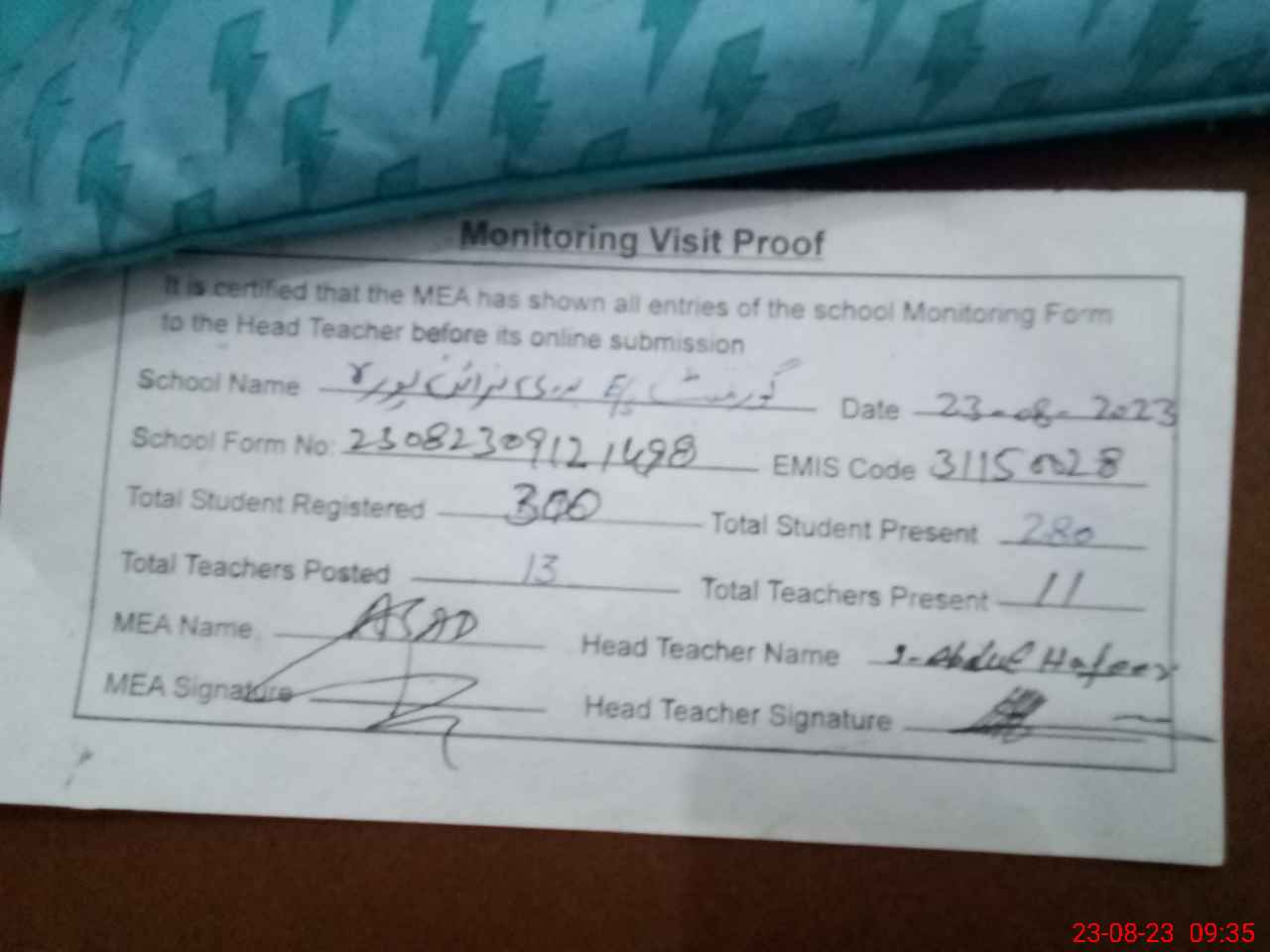| Attendance Register | Head Teacher | MEA with School | Visit Proof |