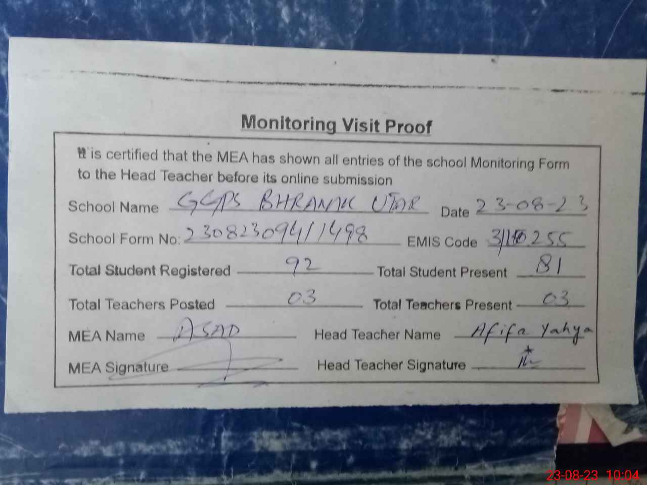 | Attendance Register | Head Teacher | MEA with School | Visit Proof |