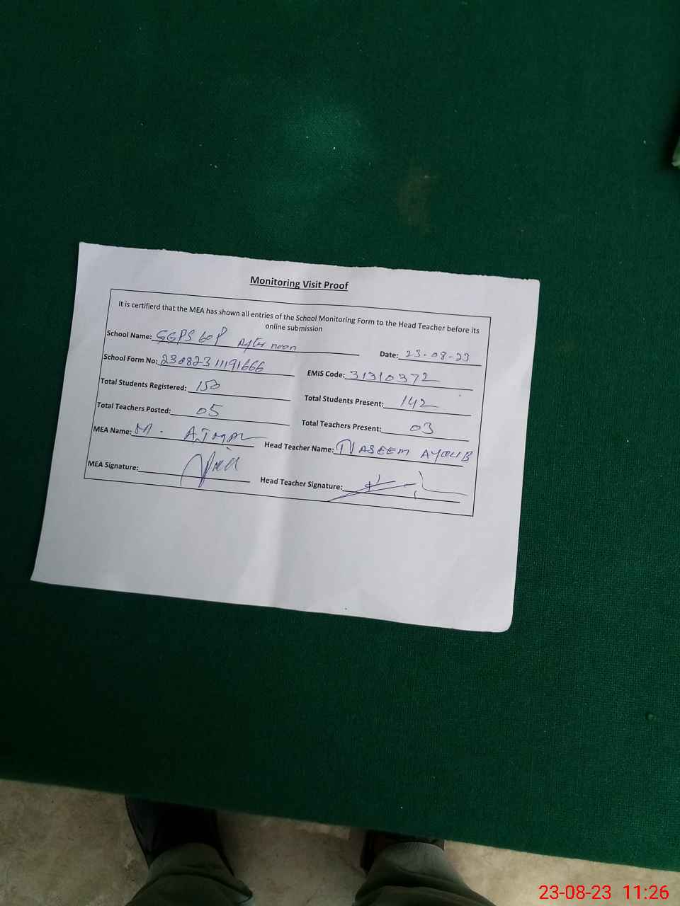 | Attendance Register | Head Teacher | MEA with School | Visit Proof |